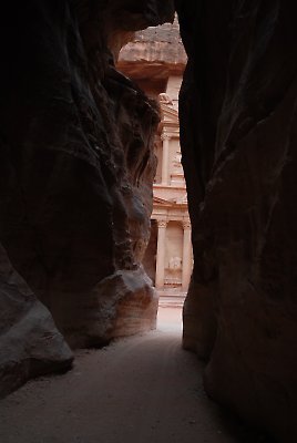 Postkartenmotiv in Petra: der erste Blick aus dem Siq auf das Schatzhaus el Khazneh