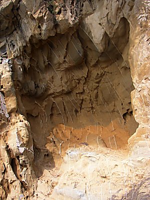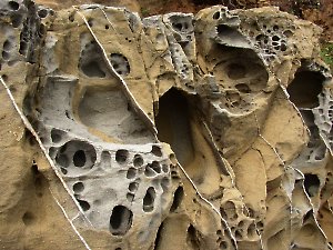 | Auch die Umgebung der Boje hat einige skurile Fotomotive zu bieten. Die Felsen sind immer wieder von feinen Marmor-Äderchen durchzogen, die sich vom restlichen Gestein abheben. Die marmoradern sind außerdem deutlich widerstandsfähiger als das umgebende Gestein, welches ordentlich durchlöchert ist. |
