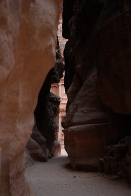 Postkartenmotiv in Petra: der erste Blick aus dem Siq auf das Schatzhaus el Khazneh